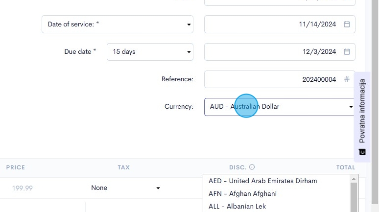13. Click on the "Currency" field to set the payment currency via the drop down