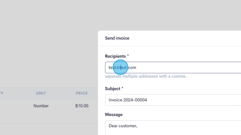 33. Click on the recipients field and type in the recipients' email address. If there are multiple emails in which this invoice needs to be sent to, please ensure you separate each invoice with a comma (Eg: john@citizen.com,john@citizen.com)