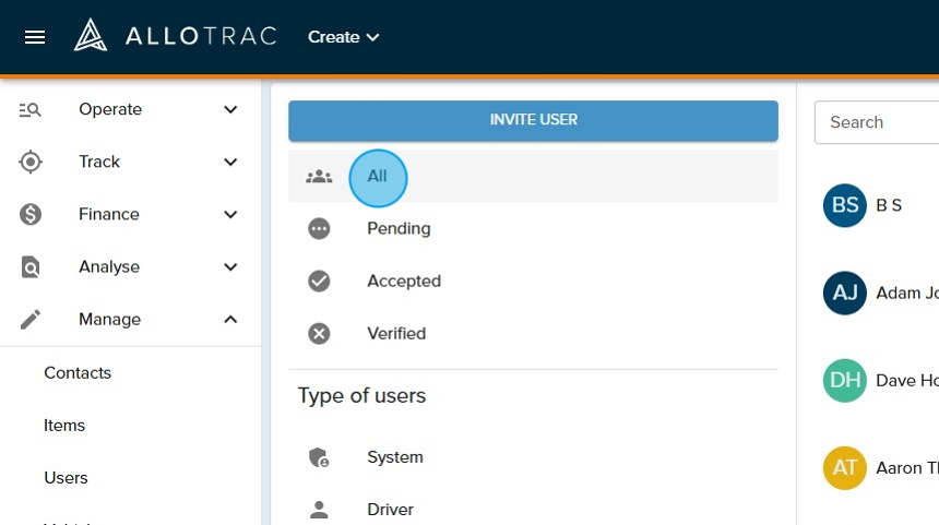4. You will now be looking at your users screen. To view all user invitations, click "All"