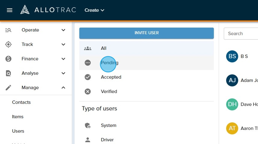 5. To view your pending user invitations, click "Pending". Pending user invitations are the invitations that you have sent, that have not yet been accepted by the user