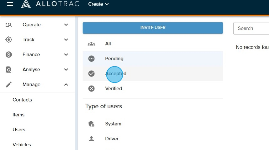 6. To view your accepted user invitations, click "Accepted". Accepted user invitations are the invitations that you have sent, that have been accepted and submitted by the user