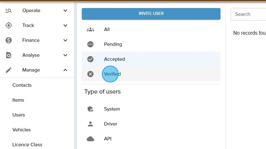 7. To view your verified user invitations, click "Verified". Verified user invitations are the invitations that you have sent, that have been accepted and submitted by the user and then finally verified by you