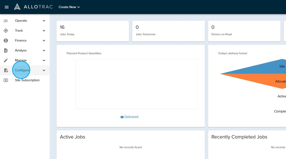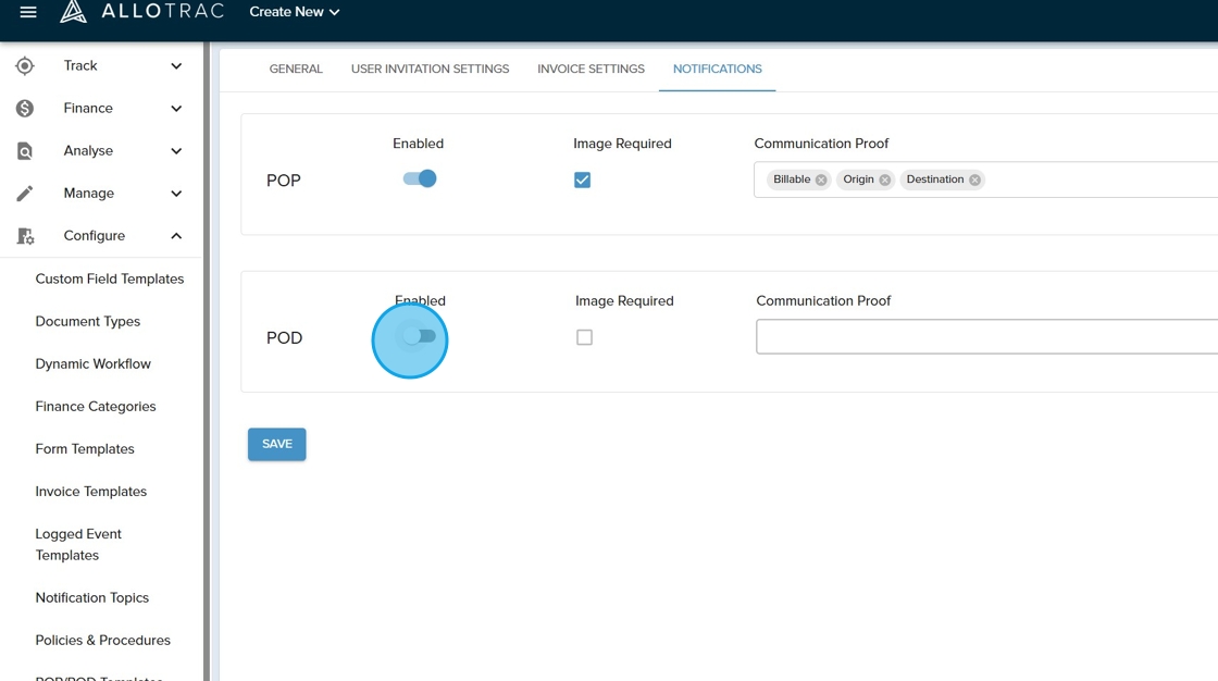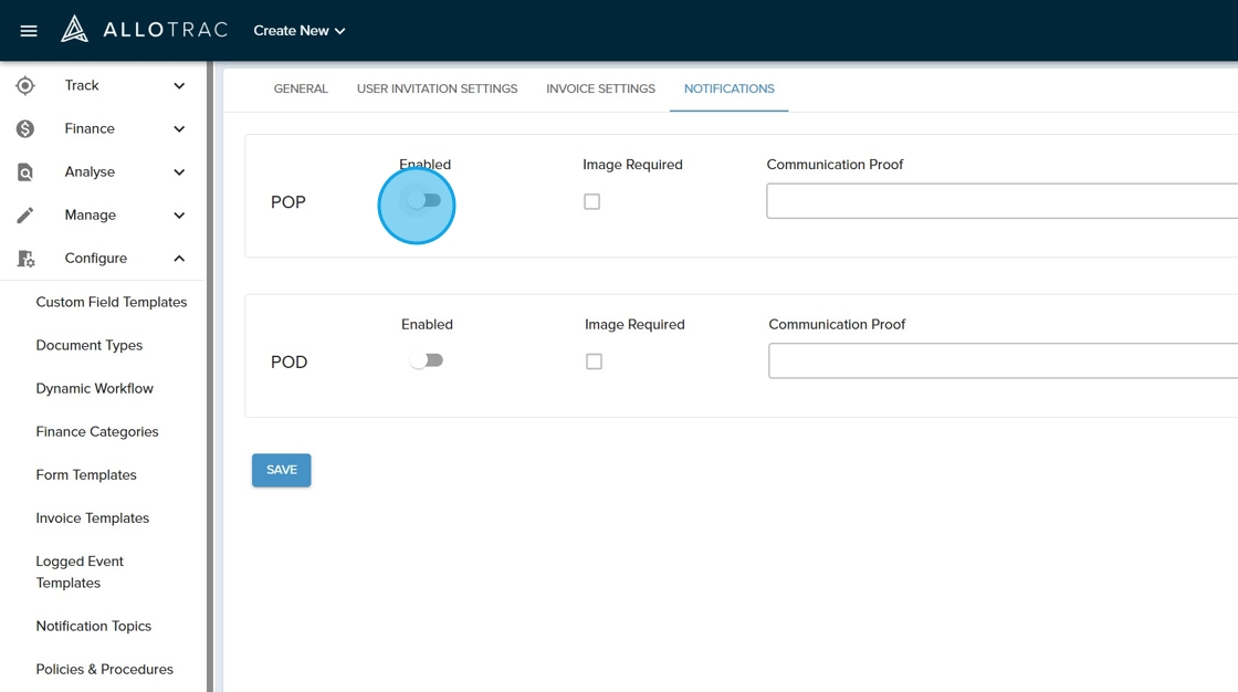 2. To enable POP or POD globally and set the standard for all newly created contacts within your Allotrac.io site moving forward, click the "Configure" tab from the side menu