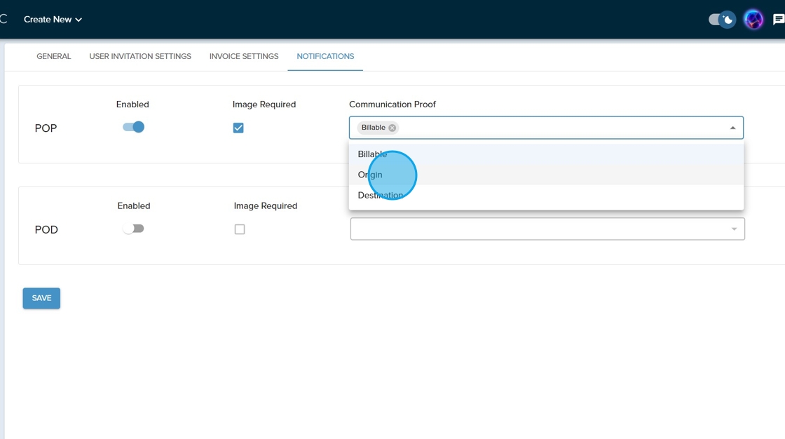 31. Click "Origin" from the dropdown if you want the origin contact in a job to automatically receive the POP email when a pickup is done at this address