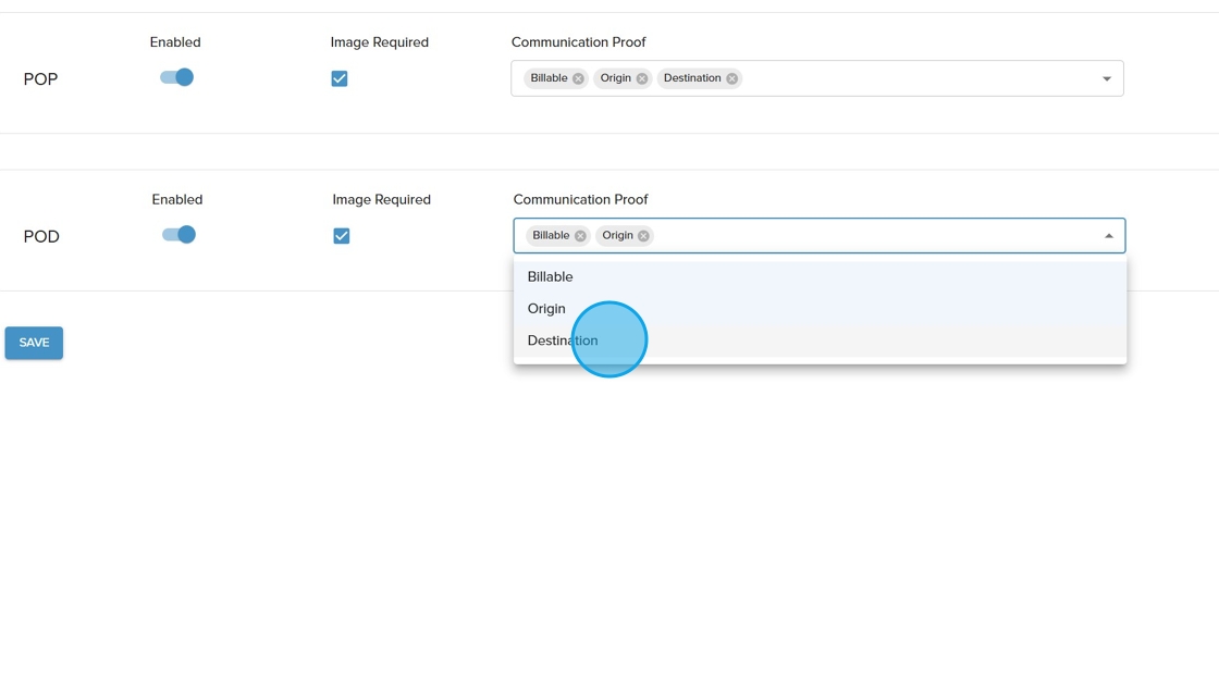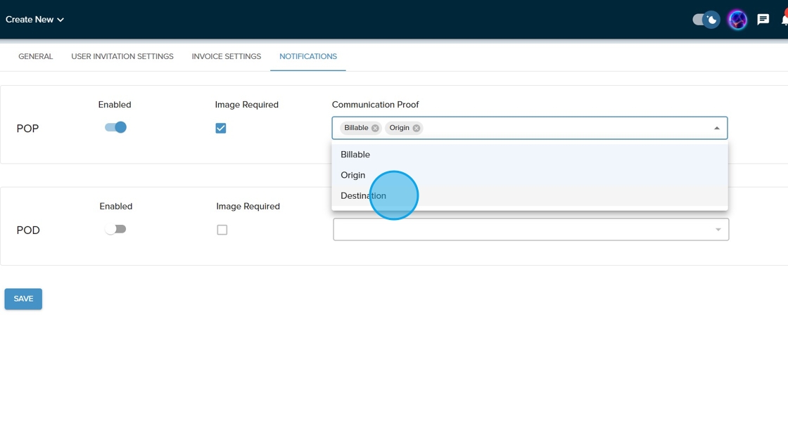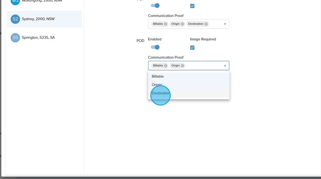 16. Click "Destination" from the dropdown if you want the destination contact to automatically receive the POD emails