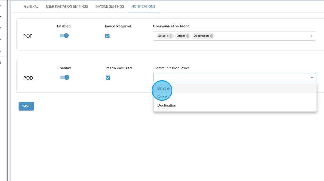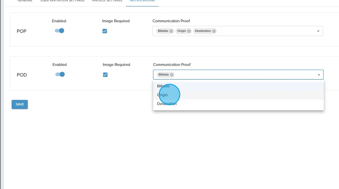 15. Click "Origin" from the dropdown if you want the origin contact to automatically receive the POD email