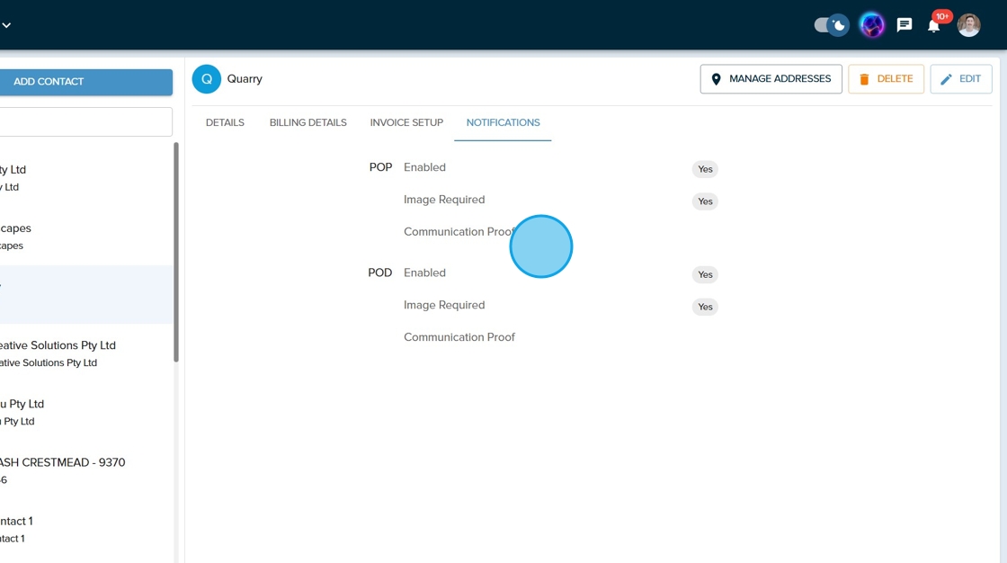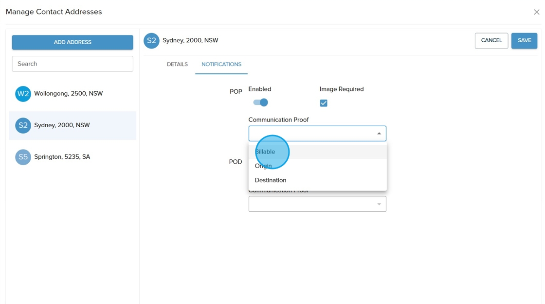 36. Click "Billable" from the dropdown if you want the billable contact in a job to automatically receive the POD email when a delivery is done at this address