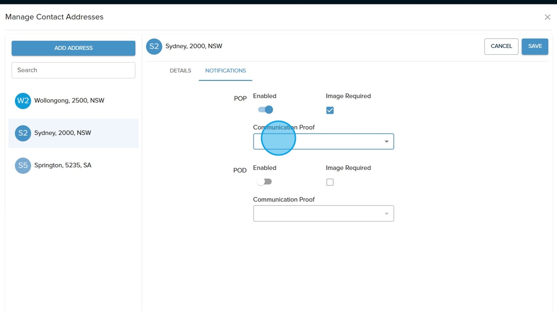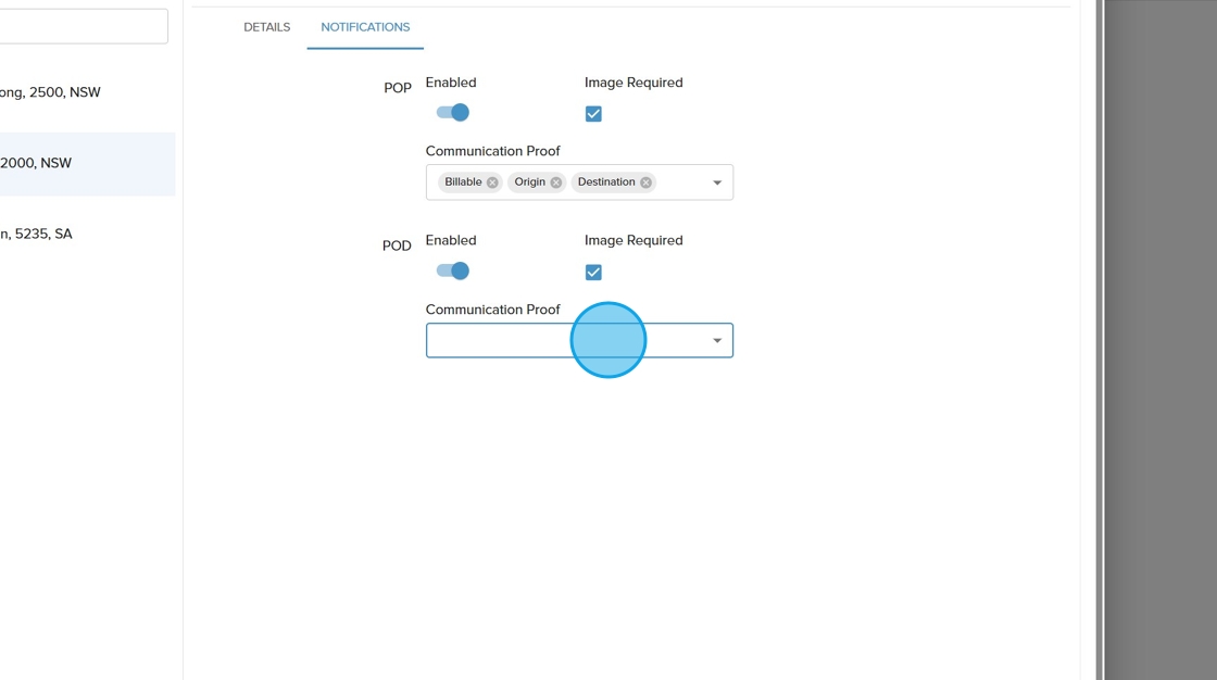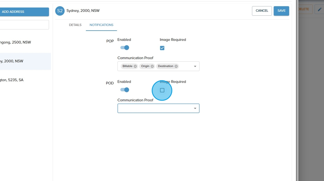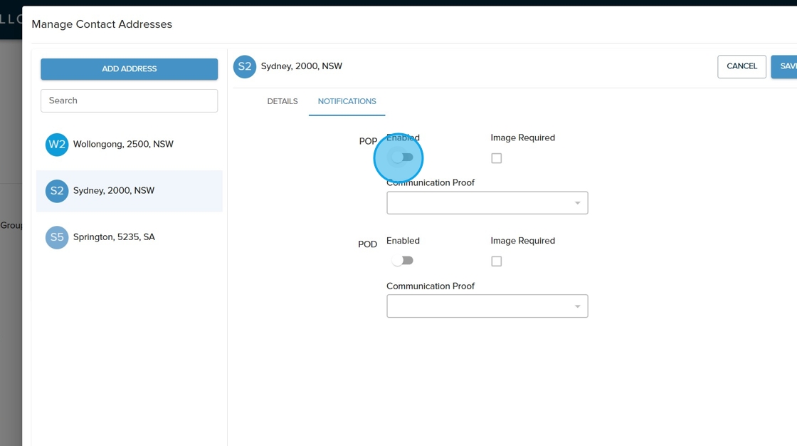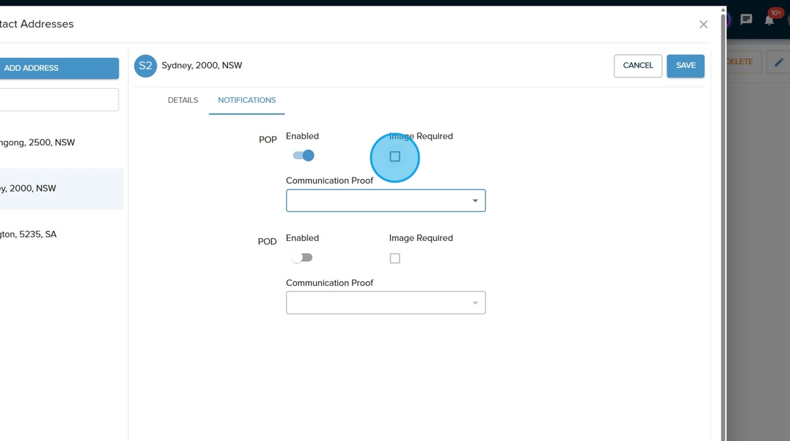 Proof of pickups (POPs) and proof of deliveries (PODs) are key components of the system, which allow you to submit images, signatures and comments as proof that you have picked up or delivered an item to/ from an address. To enable a POP/ POD in Allotrac.io, you must ensure it is configured against the address you're pickup up from (POP), or the address you're delivering to (POD)