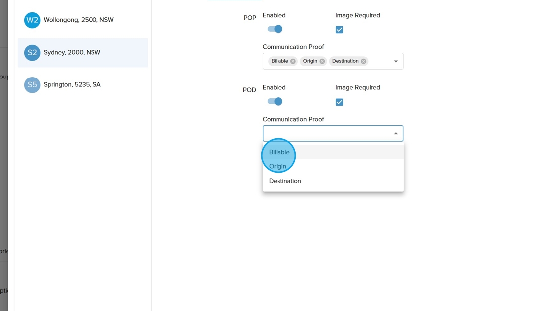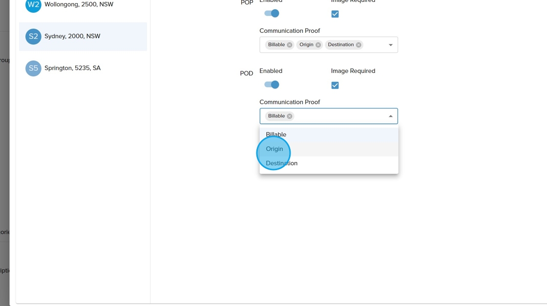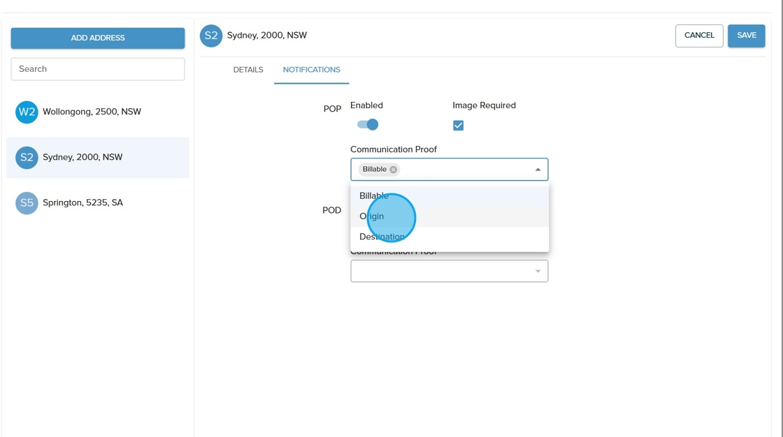 37. Click "Origin" from the dropdown if you want the origin contact in a job to automatically receive the POD email when a delivery is done at this address