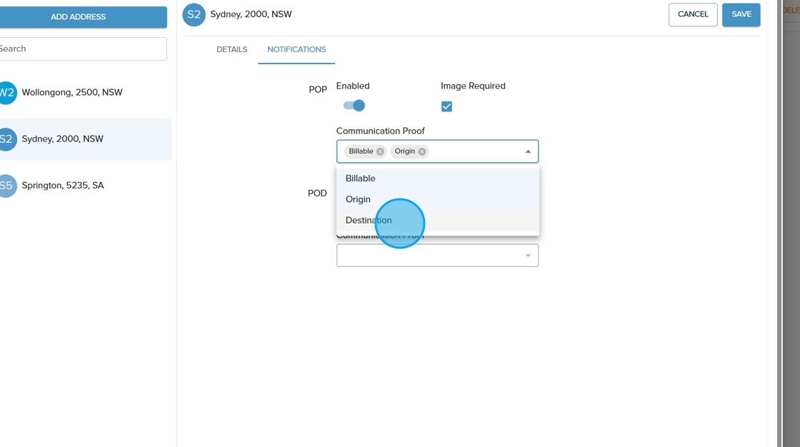 32. Click "Destination" from the dropdown if you want the destination contact in a job to automatically receive the POP email when a pickup is done at this address