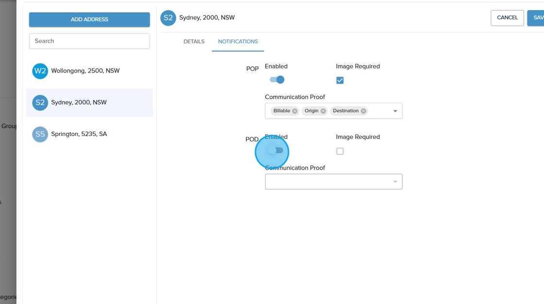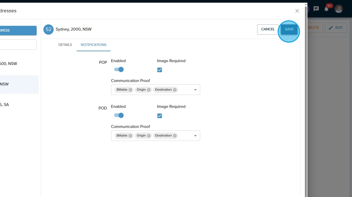 39. Click the "SAVE" button to save your changes. If you have enabled POP for this address, jobs using this address as a pickup address will inherit these rules that you have set up. If you have enabled POD for this address, jobs using this address as a delivery address will inherit these rules that you have set up